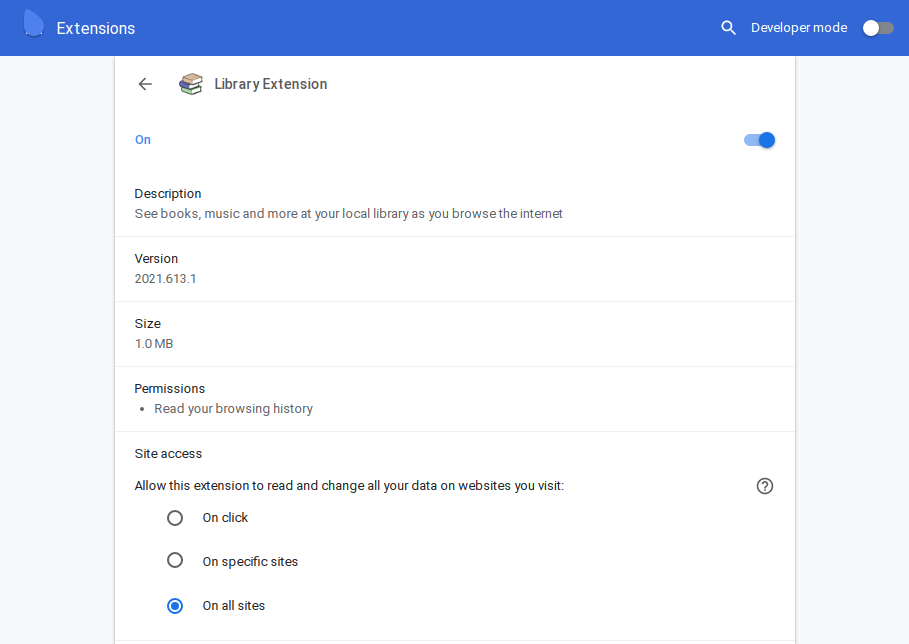 As you browse books and e-books, the Library Extension checks your library's online catalog and displays the availability of matching items on the same page.