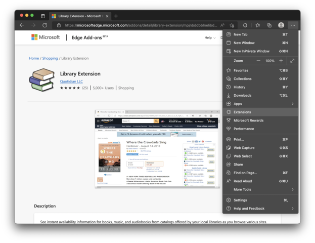 If you used the menu on the right, click on the ellipses to the right of the Library Extension listing and click on Remove from Microsoft Edge button